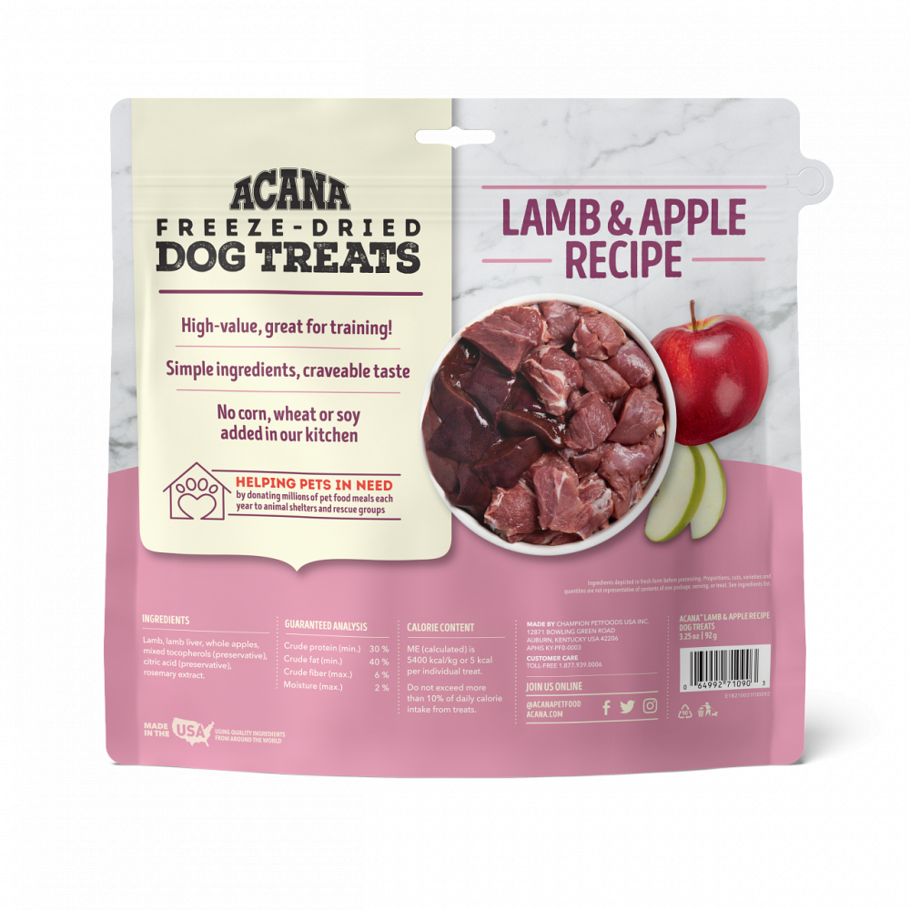 Loaded with protein and natural flavor, ACANA Lamb & Apple Treats are made with 100% raw grass-fed lamb ingredients, including meat and organs. Our lamb is delivered to our kitchen where it’s gently freeze-dried, locking in the rich nutrients and savory taste. Blended with whole, Red Delicious apples, it’s a reward that it as healthy as it is scrumptious.