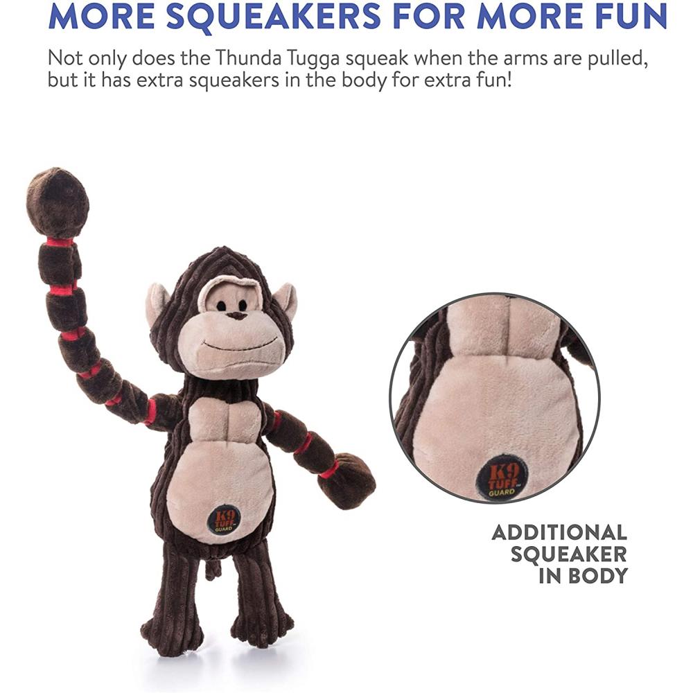 - Multiple Squeakers & Pull Through Design: Thunda Tugga dog toys come with 16 squeakers in the arms that activate when tugged by your pup. Extra squeakers are located in the head and body of the toy for maximum excitement each time they play.
