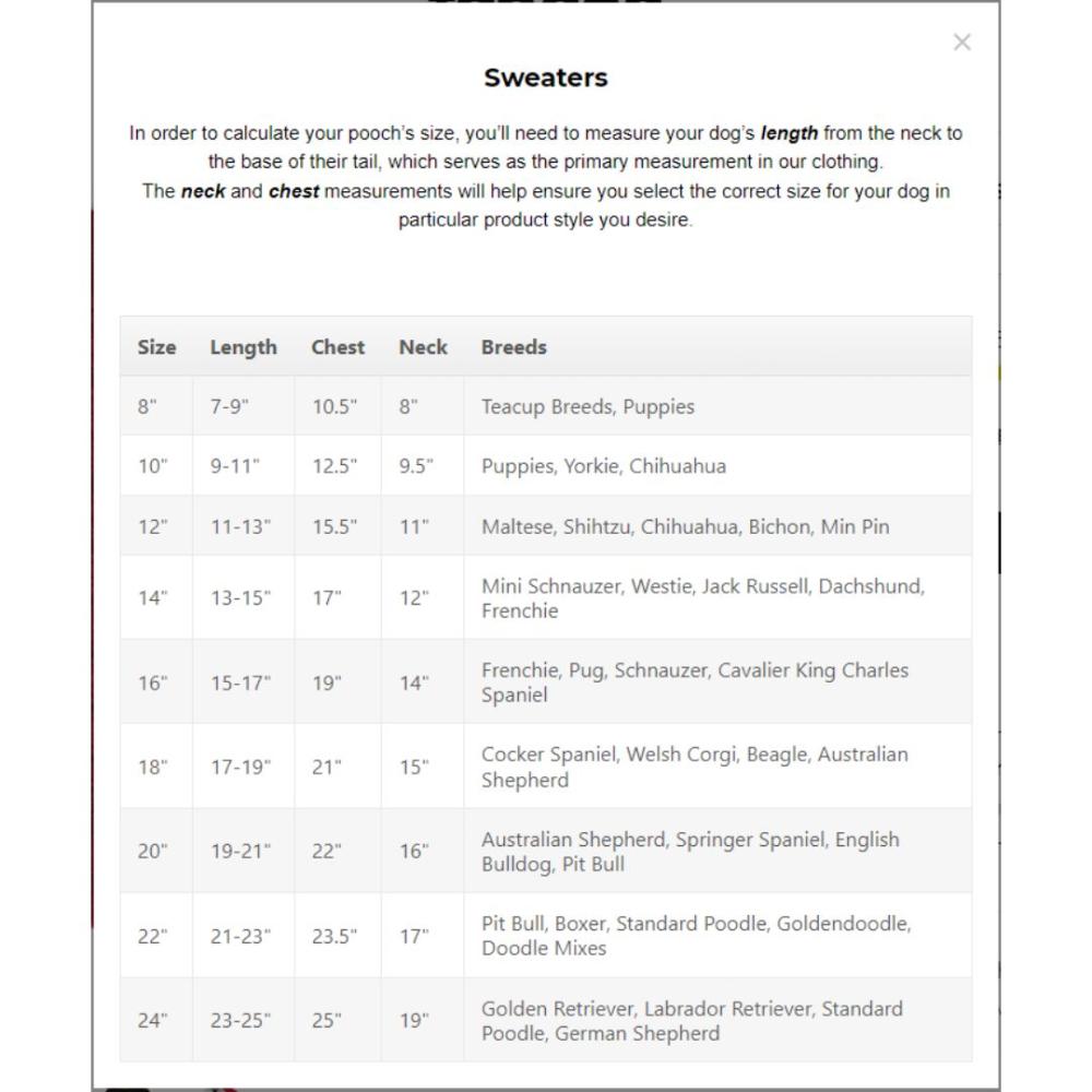 Sizes are the length of the dog in inches from the base of the neck to just before their tail.
