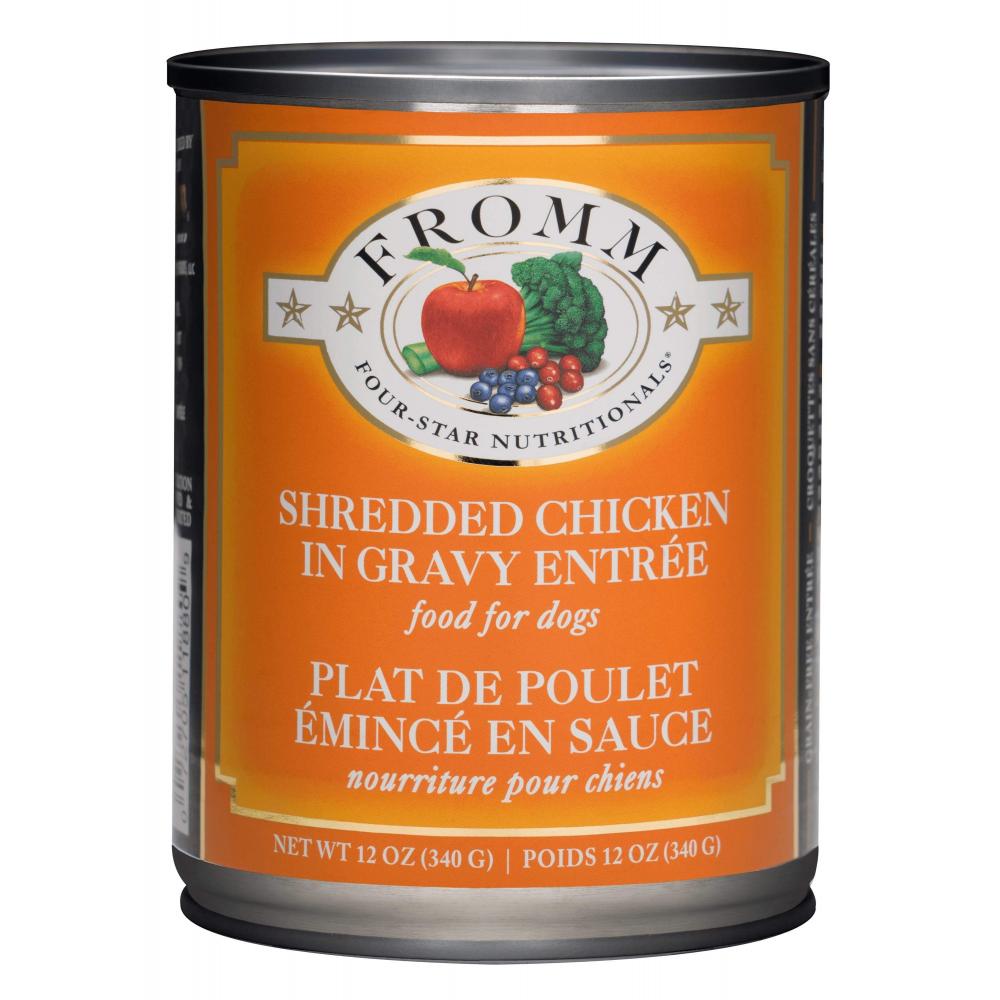 Fromm Four-Star Nutritionals Shredded Chicken in Gravy Entrée Food for Dogs is formulated to meet the nutritional levels established by the AAFCO Dog Food Nutrient Profiles for All Life Stages, including growth of large size dogs (70 lbs. or more as an adult).