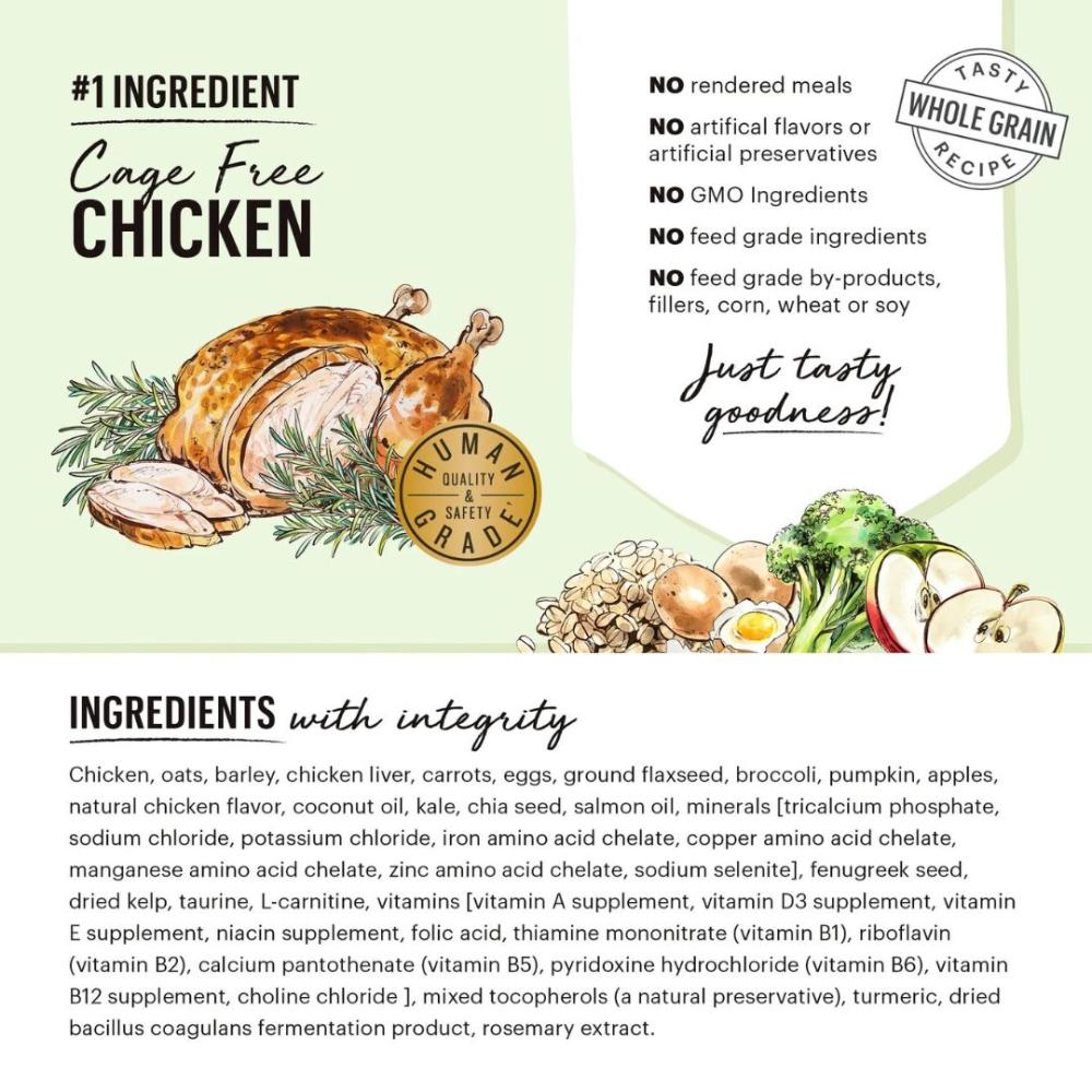 Ingredients: Chicken, oats, barley, chicken liver, carrots, eggs, ground flaxseed, broccoli, pumpkin, apples, natural chicken flavor, coconut oil, kale, chia seed, salmon oil, minerals [tricalcium phosphate, sodium chloride, potassium chloride, iron amino acid chelate, copper amino acid chelate, manganese amino acid chelate, zinc amino acid chelate, sodium selenite], fenugreek seed, dried kelp, taurine, L-carnitine, vitamins [vitamin A supplement, vitamin D3 supplement, vitamin E supplement, niacin supplement, folic acid, thiamine mononitrate (vitamin B1), riboflavin (vitamin B2), calcium pantothenate (vitamin B5), pyridoxine hydrochloride (vitamin B6), vitamin B12 supplement, choline chloride ], mixed tocopherols (a natural preservative), turmeric, dried bacillus coagulans fermentation product, rosemary extract.