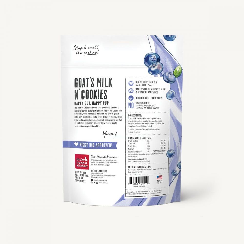 The Honest Kitchen believes that good dogs shouldn't settle for boring biscuits! With each bite of our Goat’s Milk N' Cookies, your pup gets a delicious dip of rich goat’s milk, juicy blueberries and a touch of sweet vanilla. Each little cookie is slow baked in small batches and full of probiotics to support a happy belly. Flavor meets function in every bite.