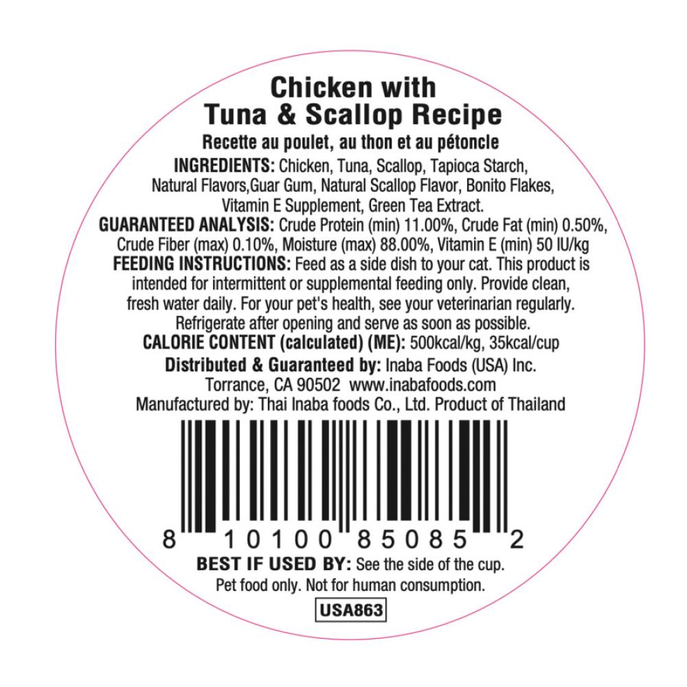 Ingredients: Chicken, Tuna, Scallop, Tapioca Starch, Natural Flavors, Guar Gum, Scallop Extract, Bonito Flakes, Vitamin E Supplement, Green Tea Extract