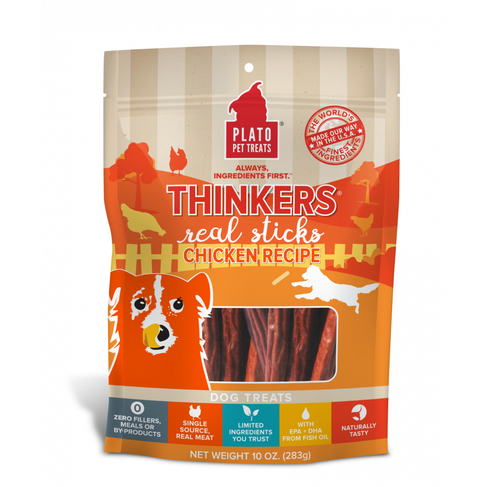 From Plato: Thinkers Chicken are hearty, meat-packed sticks with added EPA and DHA to support healthy brain function. Made with real chicken as the 1st ingredient, these treats are made with limited ingredients, are naturally preserved, and contain no artificial flavors, corn, wheat, or soy. Because of their large size, Thinkers offer substantial chewing satisfaction or can be broken into smaller pieces to create multiple treats. And we take the extra time to air-dry them in batches in our USA facility instead of baking them in order to retain more of the ingredients’ inherent nutrients (but your dog will just think that they smell and taste amazing). It takes longer, but we think its worth it.