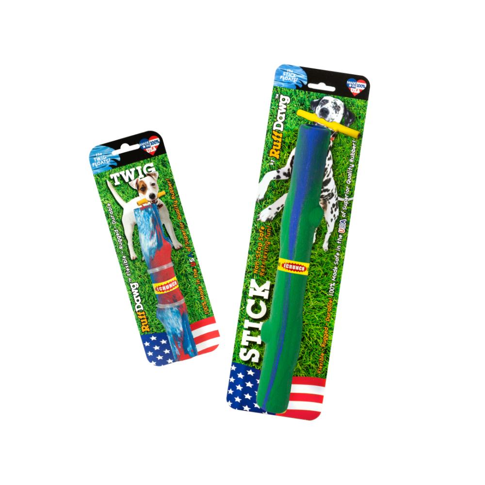 Get all the floating, fetching fun of the real thing – splinter free – with some extra Crunch! Rugged and durable, just like original Stick & Twig, but with a special lining that gives these toys a crunchy sound that drives dogs wild. Stick is a sure favorite of large dogs, and Twig is great for smaller breeds. Perfect for retrieving, games of keep-away, tugging, and adorable photo-ops, both can be strung on a rope for added fun. In assorted bright marbled colors.